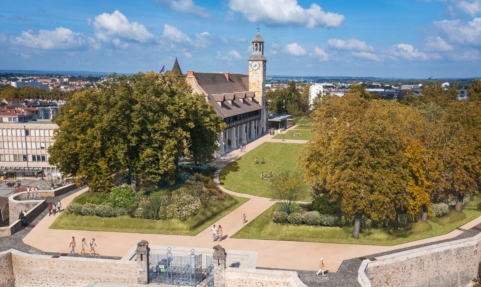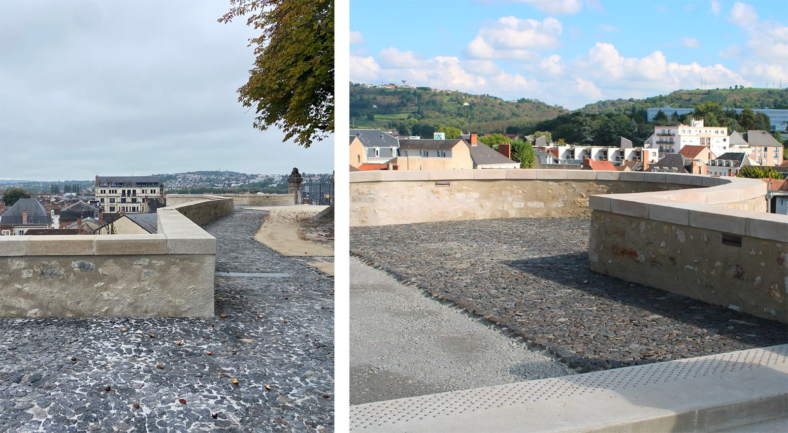 Requalification complète de l’esplanade : revêtement de sol, boulingrins inversés, plantations. Restauration complète des parapets avec écrétage des créneaux factices, remaçonnage, margelle en granit, pose et fourniture d’un éclairage sur l’ensemble du chemin de ronde.