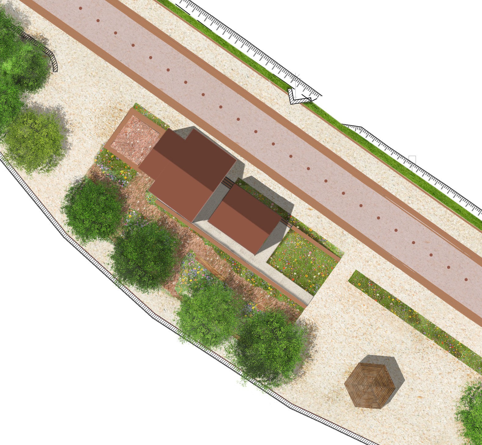 L’extension se déploie vers un glacis planté qui accompagne la rampe PMR. Ce sol travaillé (pierre en socle, béton désactivé en surface, garde-corps métallique) articule les niveaux et inscrit le projet dans la topographie du site. L’ensemble compose une intervention sobre et cohérente, qui réactive la mémoire ferroviaire du lieu tout en l’adaptant aux usages contemporains.